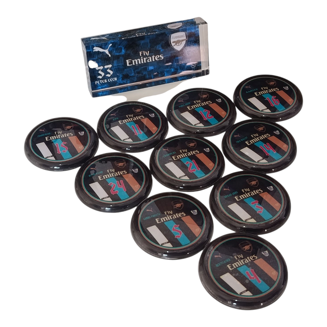 Contém 1 time com 10 jogadores em lentes de policarbonato (vidrilhas) de 45mm ou 55mm de diâmetro + goleiro oficial de acrílico com arte frente e verso + palheta de 50mm de diâmetro + bolinha estilo pastilha + caixinha personalizada do time.